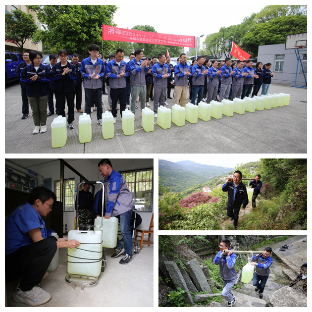 簡(jiǎn)短的啟動(dòng)儀式后,志愿服務(wù)車隊(duì)有序出發(fā),把30桶凈水消毒劑分別運(yùn)送至四明山區(qū)的三石里、棠溪、步梯巖、北溪等偏遠(yuǎn)水站。由于山路崎嶇陡峭,每桶藥劑重達(dá)30公斤左右,大家只能用小車?yán)?、雙人抬扛等方式配送,雖然累得氣喘吁吁、汗流浹背,但大家相互鼓勵(lì)、相互協(xié)助,齊心協(xié)力超額完成了當(dāng)天的配送任務(wù)。